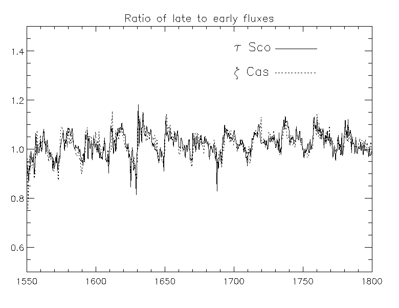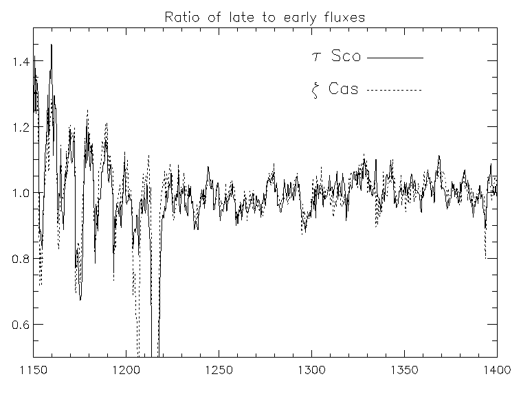 This figure and the one below show the time dependence of SWP NEWSIPS large aperture extractions in the spectra of two stars: tau Sco and zeta Cas. They show ratios of the means of 10 spectra obtained in 1993-94 divided by 10 spectra obtained in 1981-82 for each star for two different wavelength regions. The solid curve is for tau Sco and the dotted one for zeta Cas. Both sets of data were binned to 0.5 Å/point.