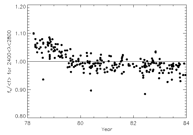 Figure 2: Plot of LWR fluxes across the band 2400< lambda < 2800Å. Each point is the mean flux across the band for a star normalized by the mean value for that star.