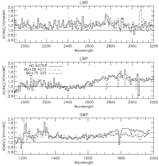 Figure 3: Ratios of observed to MXLO modeled standard deviations for the low dispersion standards listed in Table 1. All 3 standards are overplotted, with line styles given by the key.
