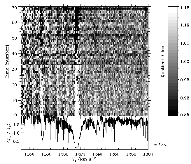 Figure 4: Time dependence of 71 SWP high dispersion NEWSIPS MXHI spectra of tau Sco obtained over the lifetime of IUE -- only the short wavelength region is shown. The spectra are normalized by their mean and the temporal ordinate is simply the accumulated number of spectra.