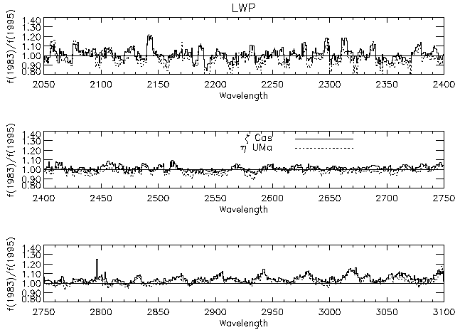 Figure 8: Time dependence of LWP NEWSIPS large aperture extractions of zeta Cas (solid) and eta UMa (dotted). The curves are ratios of 10 spectra means from 1993-94 divided by 10 spectra means from 1981-82 for each star (all binned to 0.5 Å/point).